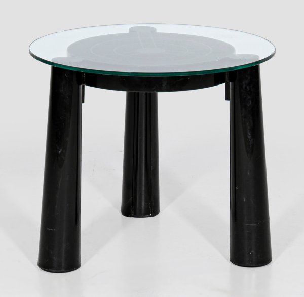 Schwarzer Kunststoff. Runde Sitzfläche, flankiert von kräftigen, konischen Rundbeinen. Herstellerzeichen. Entw. Anna Castelli Ferrieri, 1986. Dazu runde Deckplatte aus Glas. H. 42 cm. Ges-D. 50 cm.