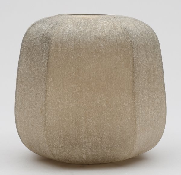 Gebauchte, 10-eckige Fruchtform mit eingezogener Mündung. Hellgraues Rauchglas, die Wandung mit flächendeckend mattierter, strukturierter Oberfläche nach dem Vorbild der "Battuto" und Inciso"-Technik von Venini, die Mündung abgesetzt, geschliffen und poliert. H. 32,5 cm.
