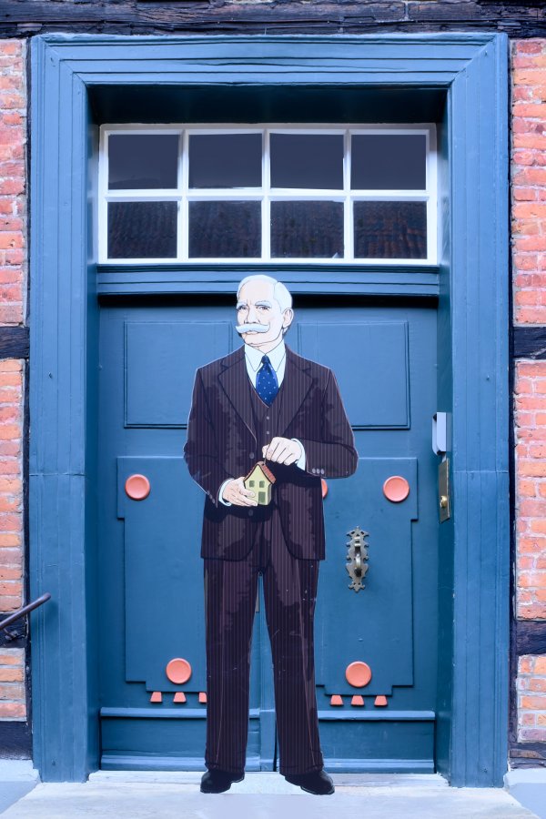 Holz, Metall. Lebensgroße, schauseitig polychrome Darstellung des Wüstenrot-Gründers Georg Kropp (1865 - 1943), der ein kleines Haus in seinen Händen hält. Ges.-H. 205 cm.