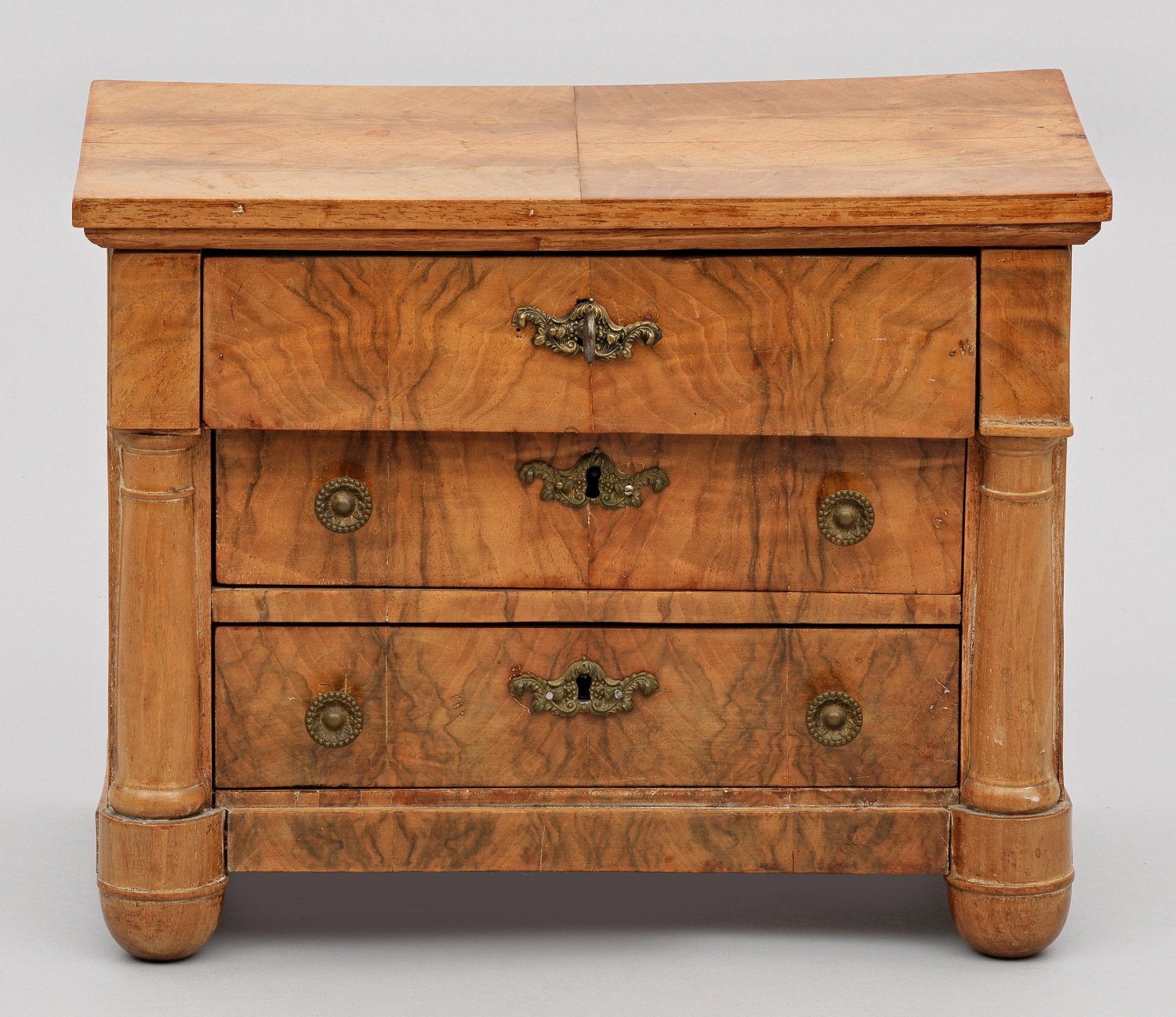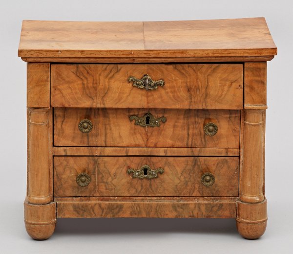 Helles Nussbaum, furniert. Gerader, querrechteckig angelegter Korpus auf gerundeten Füßen. In der gegliederten Front drei, teilw. vorkragende Schubladen, flankiert von eingestellten Halbsäulen. H. 26 cm. 33,5 cm x 21,5 cm.