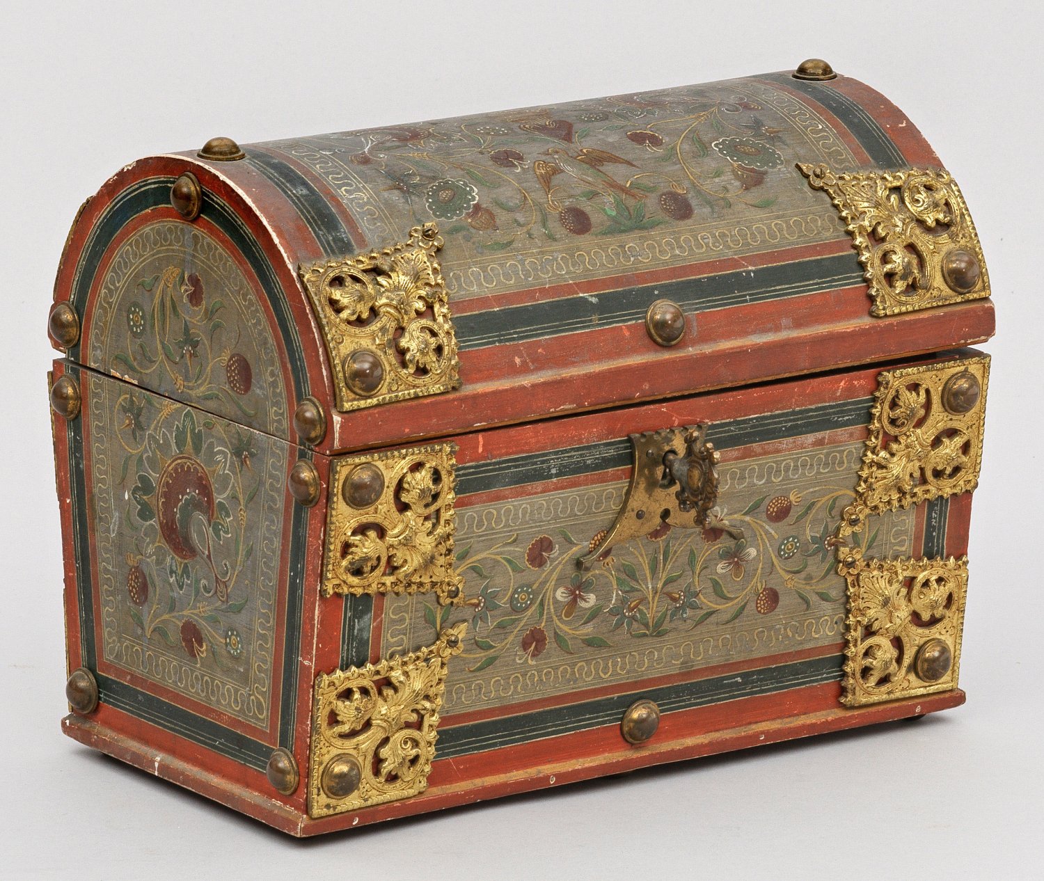 Holz mit Messingbeschlägen. Runddeckeltruhe mit rechteckiger Grundform, vorderseitigem Schloss, rücks. Deckelscharnieren und stilisiert floralen Eckbeschlägen. Am Deckel und den Seiten dunkel gerahmte Kartuschen in rotem Fond vor blauem Hintergrund, mit vegetabilen Dekor in Form von Blüten und Erdbeeren. Zentral auf dem Deckel zudem ein gekröntes Herz unter zwei verschränkten Händen sowie zwei Vögel. Mit roter Seide augekleidet. Schlüssel. Altersspuren. H. 22 cm. 26 cm - 16,5 cm.