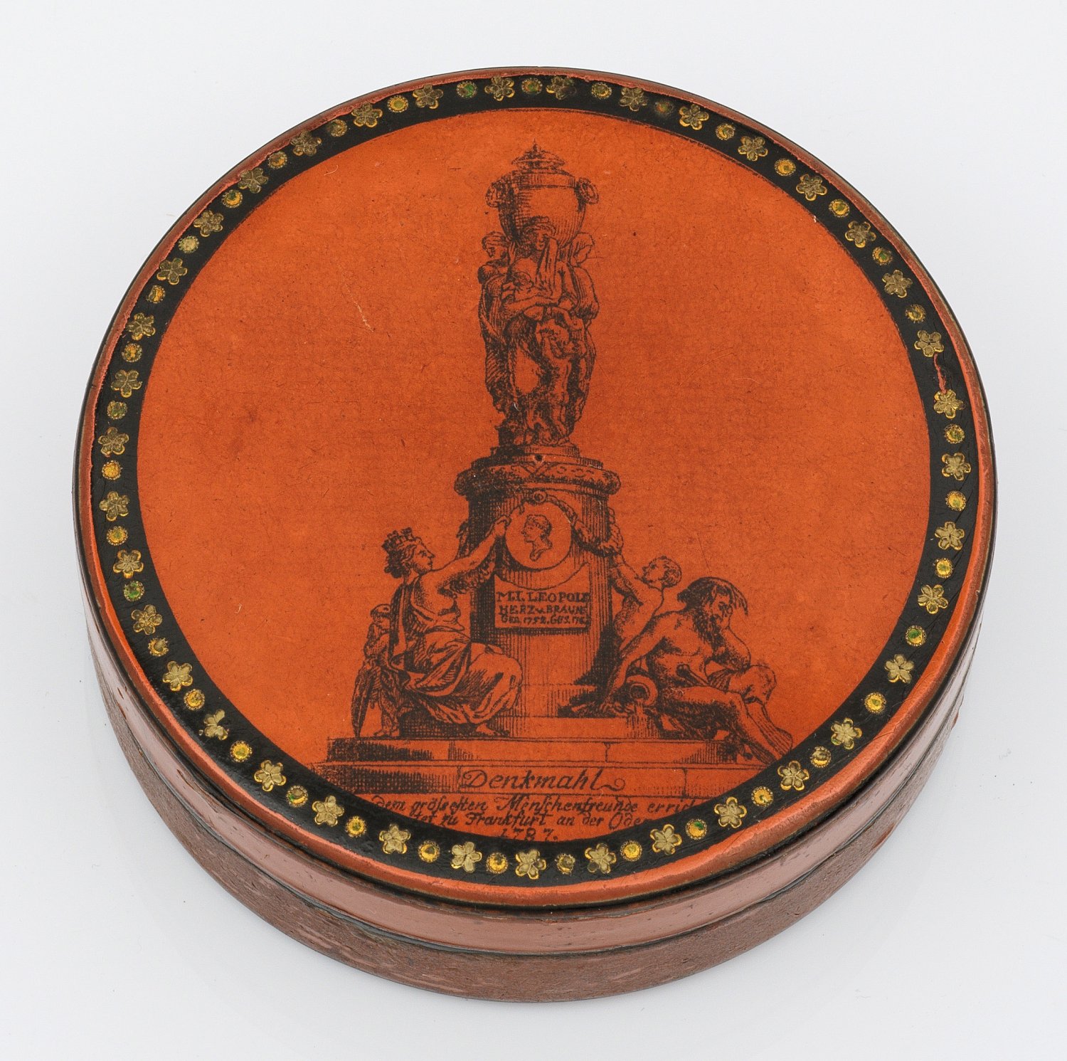 Pappmaché, rot lackiert. Zylindrischer Korpus. Auf dem Deckel die bez. Darstellung des Denkmals für Herzog Leopold von Braunschweig und Lüneburg (1752-1785) in Frankfurt a. d. Oder, 1787, umzogen von schwarzem Zierband mit goldenem Sterndekor. Bodenunterseite mit geschriebenen Trauerzeilen. Der preussische Generalmajor ertrank 1785 in der Oder bei der Fahrt zu seinen Soldaten auf der anderen Uferseite. H. 1,7 cm. D. 9,7 cm.