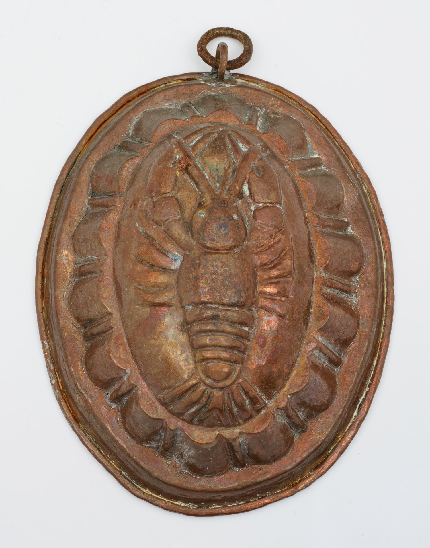 Kupfer, innen verzinnt. Ovale Grundform mit gewellter Wandung, Oberseite reliefiert mit stilisiertem Hummer. Öse mit Ringgriff am Rand. H. 6 cm. L. 19,5 cm.