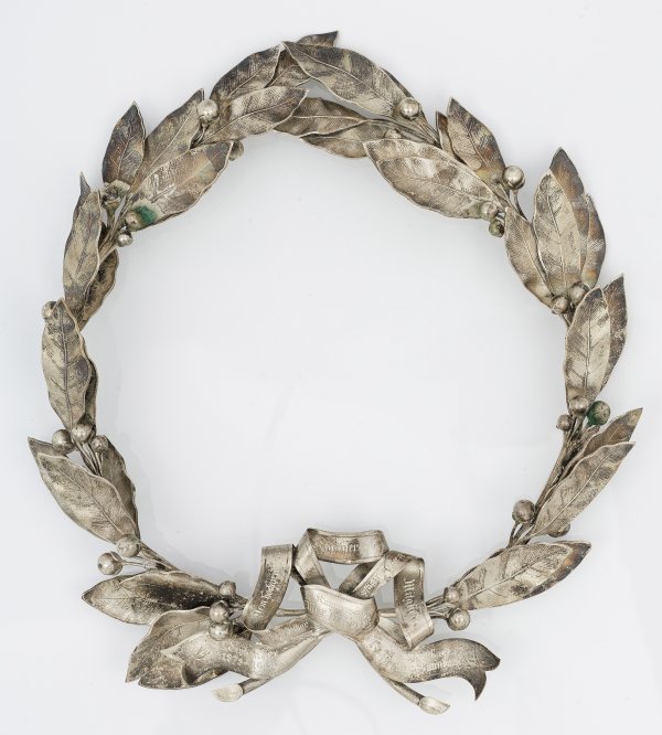 Versilbert. Naturalistisch ausgearbeiteter Lorbeerkranz, Schleife mit gravierter Widmung "September 1878 – 1903, dem hochverdienten Künstler und unwandelbar pflichtgetreuen Mitgliede K. Kammersänger Max Mikorey, die dankbare Hoftheater Intendanz". Besch.; H. 29 cm.