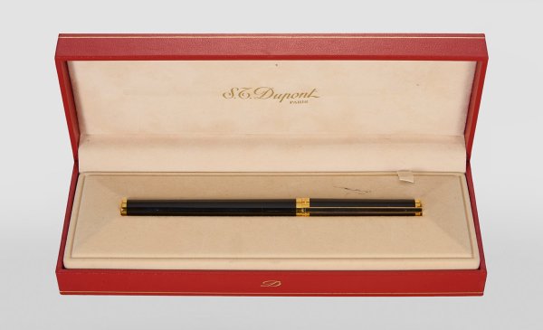 A Vintage Dupont gilt metal black Chinese lacquer fountain pen. 18 k gold nib. Three refills, converter and sachet. Minor signs of use. Manufacturer's mark. Original box and papers.