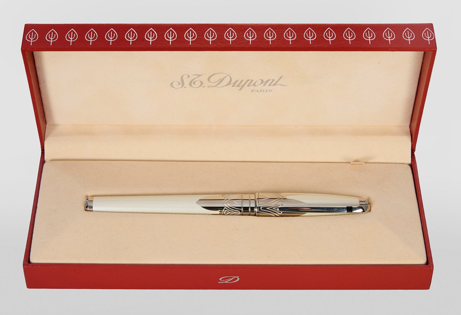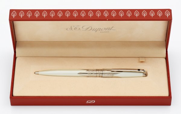 A Vintage Dupont set, with fountain pen and ballpoint pen. Platinum plated metal and mother-of-pearl-coloured Chinese lacquer. 18 k white gold nib, with refills. Manufacturer's mark. Original boxes and papers.