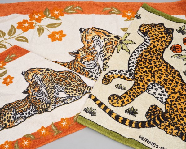 Rechteckige Frottee-Baumwolltücher und Badematte mit polychromem Dekor. Auf grün bzw. orange gerahmtem, hellen Grund mit vegetabiler Staffage einander zugewandte Raubkatzen. Entw. Christiane Vauzelles, Robert Dallet. "Hermès Paris"-Schriftzug. Gebrauchsspuren. 65 cm x 91 cm - 95 cm x 150 cm.