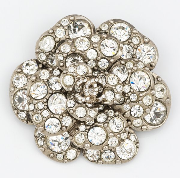 Brosche in Form einer Kamelienblüte, ausgefasst mit Strasssteinen, mittig CC-Logo, Herstellerzeichen und Nr. 09V. Zwei Steine fehlen. Original Box.