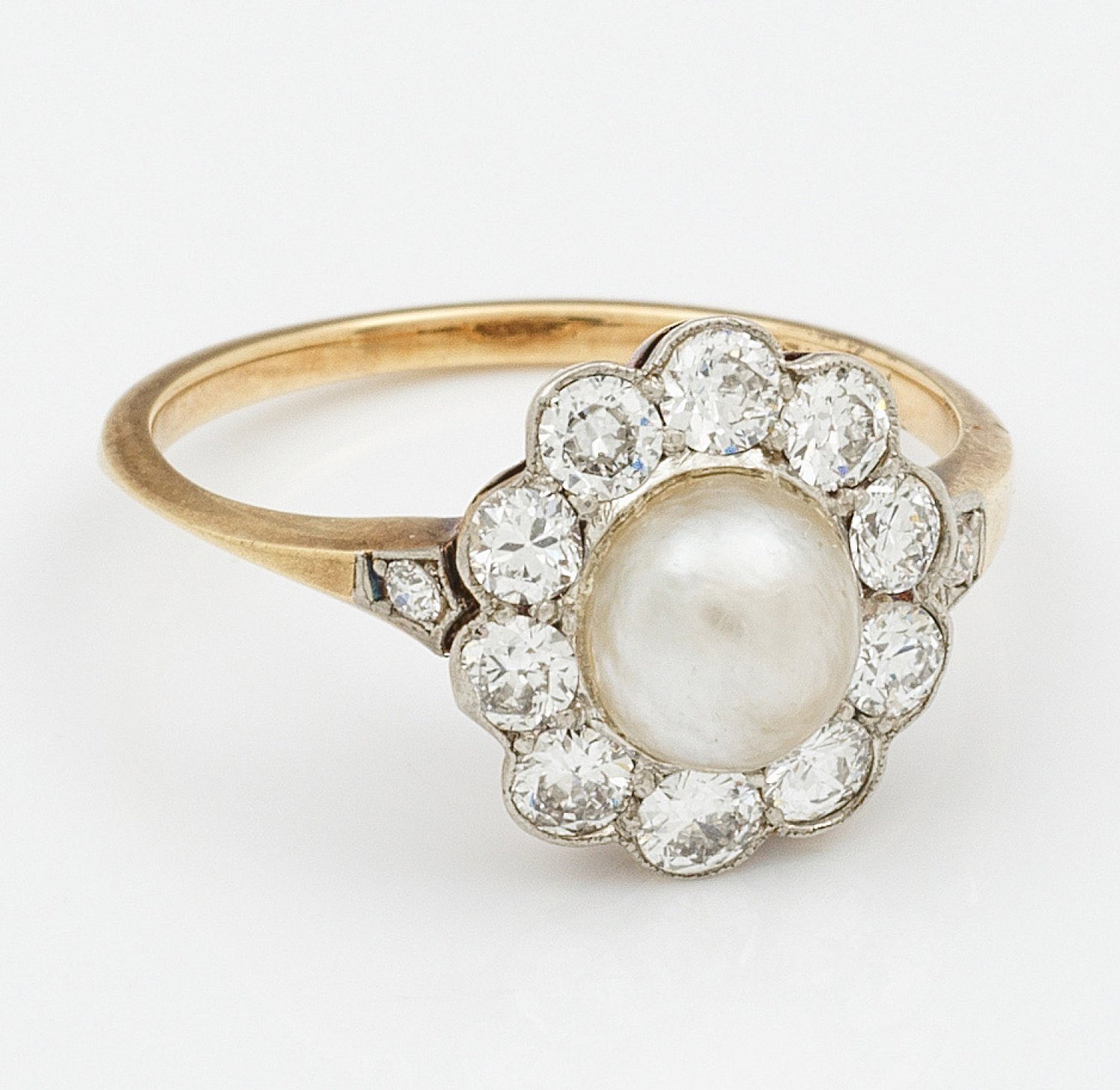 Gelbgold, 14 ct.; Zentral besetzt mit cremefarbener Boutonperle in sehr feinem, rosé-grün changierendem Lüster, entouriert von Altschliffdiamanten von zus. ca. 1,00 ct.; Gew. ca. 2,88 g.
