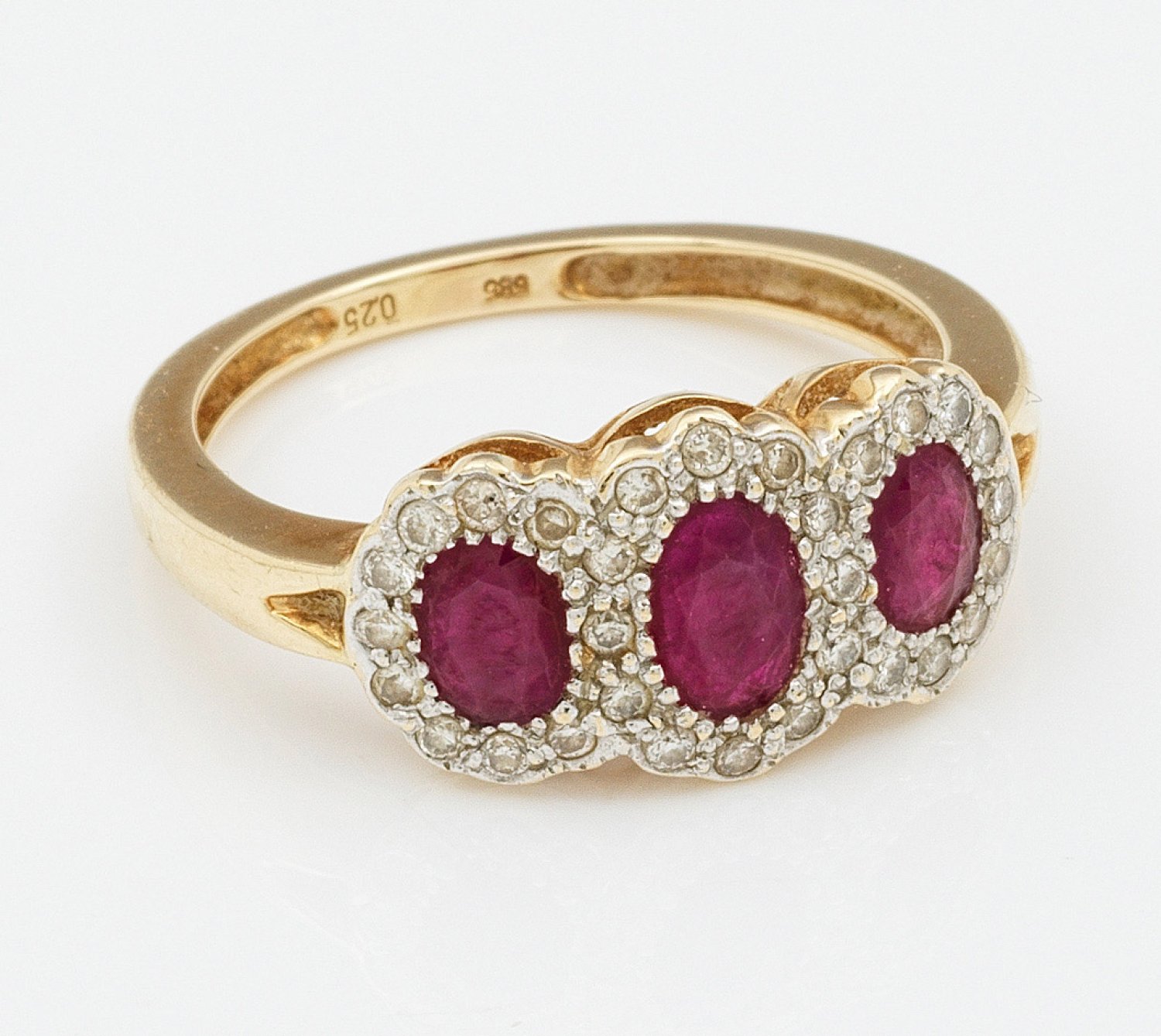 Gelbgold, gest. 585. Besetzt mit 3 taubenblutroten Rubinen von zus. ca. 0,60 ct., entouriert von kleinen Diamanten. Gew. ca. 3,68 g.