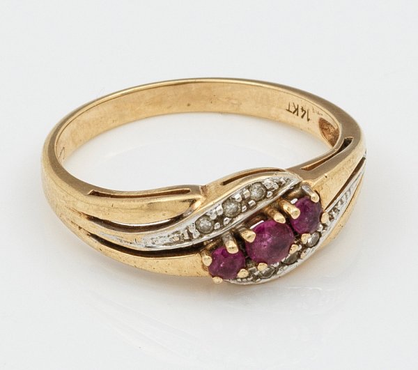 Gelbgold, gest. 14 ct.; Besetzt mit 3 Rubinen von zus. ca. 0,30 ct. und kleinen Diamanten. Gew. ca. 3,49 g.