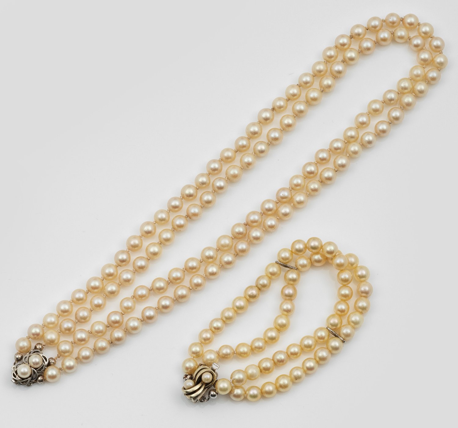 Necklace and bracelet set with cream coloured cultured pearls of approx. 4 mm. Clasp in 8 k white gold.