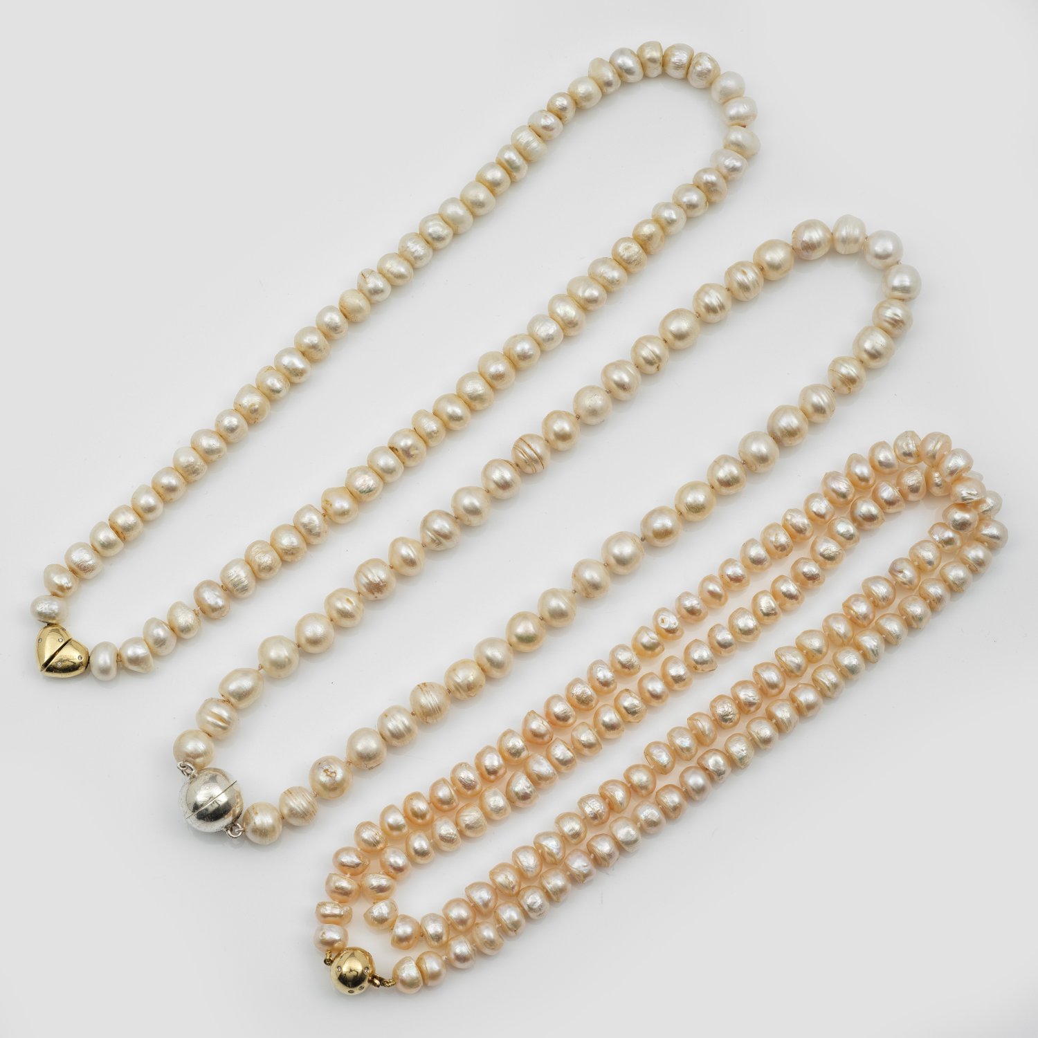Gelbgold, gest. 585 sowie Silber, gest. 925; Drei einreihige Ketten aus weißen und cremefarbenen Süßwasser Barock-Perlen von ca. 9 mm in farbintensivem, rosé-grün changierendem Lüster. Goldschließen besetzt mit Brillanten.