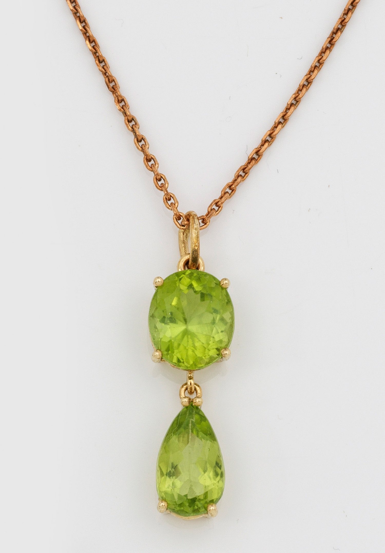 Roségold, 14 ct.; Schauseitig besetzt mit 2 apfelgrünen Peridots von ca. 3,10 ct. im Tropfen- und Ovalschliff, an feiner Gliederkette. Ges.-Gew. ca. 4,80 g.