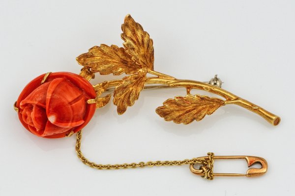 Gelbgold, 18 ct.; Plastisch gestalteter Rosenzweig, Blütenkopf aus lachsfarbener Koralle. Gew. ca. 12,92 g. Sehr schöne Goldschmiedeausführung.