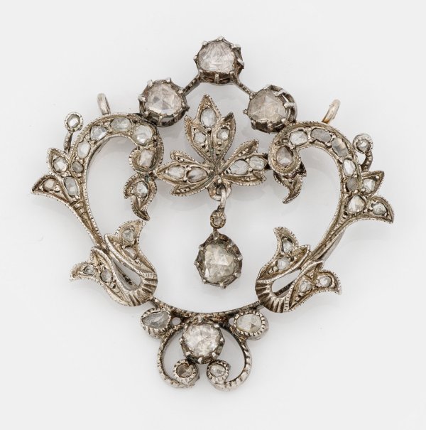 Weißgold, 14 ct.; Kartuschenförmiger Anhänger aus reliefierten Blattranken und Kelchblüten, ausgefasst mit Diamantrosen von zus. ca. 1,80 ct., umzogen von feinen Millegriffbändern. Gew. ca. 8,69 g.