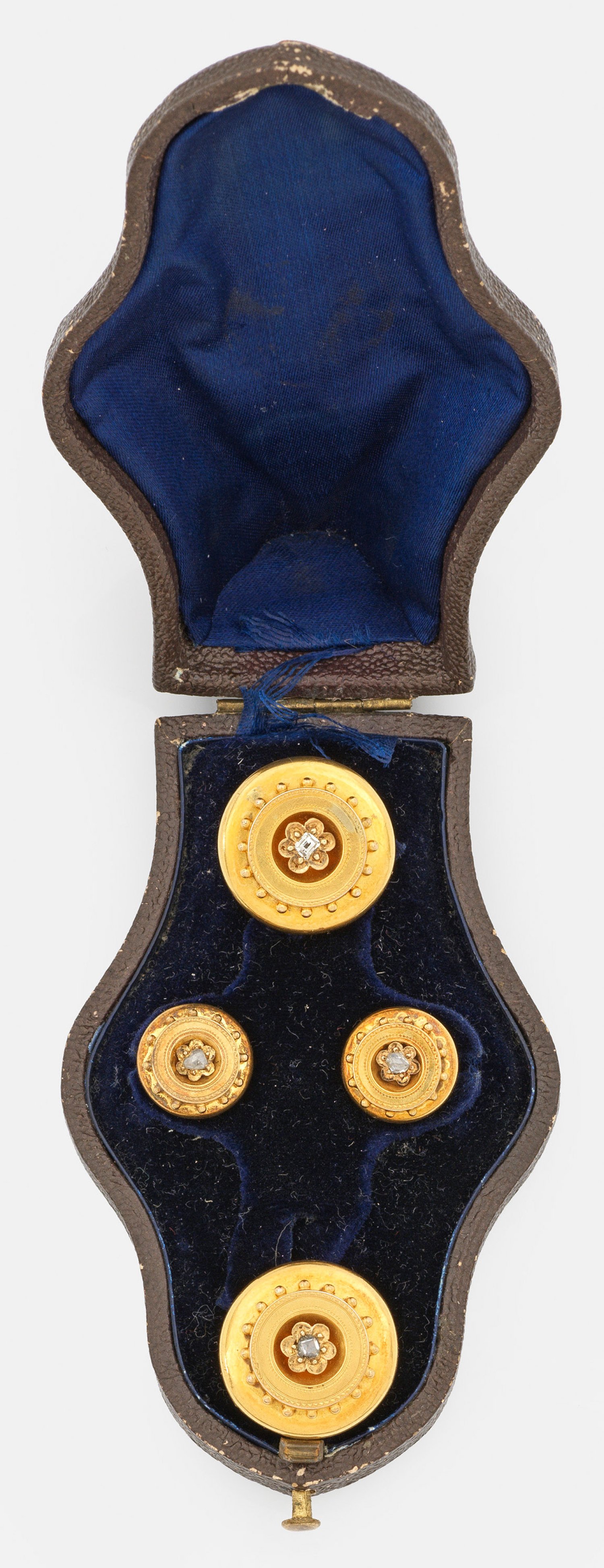 Gelbgold, 14 ct.; Paar Manschettenknöpfe mit korrespondierendem Paar Kragenknöpfen. Boutonform mit feinem ornamentalen Gravur- und Granulatdekor sowie Blütenrosetten mit Diamantrosen. Original Lederetui. Ges.-Gew. ca. 8,93 g.