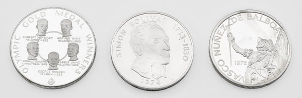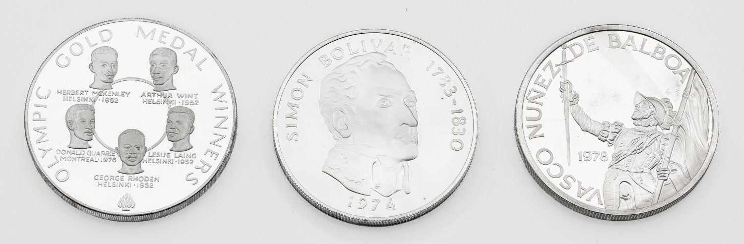 Zwei 20 Balboas Sterlingsilber-Münzen mit Simon Bolivar (1783-1830), 1974 sowie mit Vasco Nunez de Balboa, 1978 zum 75-jährigen Bestehen der Republik Panama und eine 25-Jamaica-Dollars-Münze, Olympische Spiele 1980 Moskau, mit jamaikanischen Goldmedaillengewinnern; in Original-Kapseln sowie Boxen. Zwei mit Zertifikat. Gew. zus. ca. 400 g.