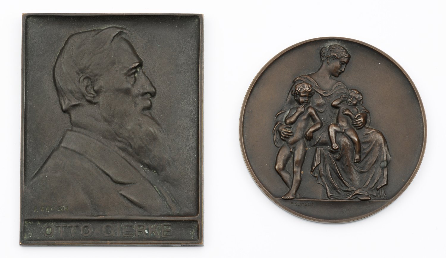 Bronze, dunkelbraun patiniert, 1900 und 1910. Jeweils sign.; Die Medaille rücks. mit Inschrift in Versalien "FUER VERDIENSTE (/) UM DIE KINDERFUERSORGE (/)KOENIGL: PREUSS. MINISTERIUM (/) DER GEISTLICHEN UNTERRICHTS UND (/) MEDIZINALANGELEGENHEITEN"; die Bildnispkatte schauseitig betitelt "OTTO GIERKE". D. 8 cm bzw. 10 cm x 7,8 cm.