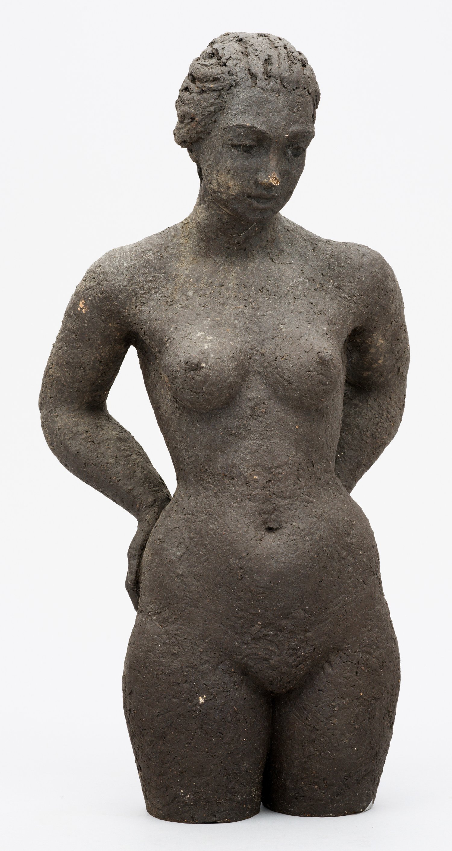 Keramik, schamottierter Scherben, schwarz engobiert. Der auch als Steinmetz ausgebildete Bildhauer Georg Arfmann studierte 1946-1950 an der "Staatlichen Kunstschule" (heute Hochschule für Künste) in Bremen, arbeitete danach freiberuflich, seit 1972 auch als Fachlehrer an der Steinmetz- und Bildhauerschule in Königslutter. Zahlreiche Arbeiten befinden sich im öffentlichen Raum, vorwiegend in Norddeutschland. H. 48 cm.