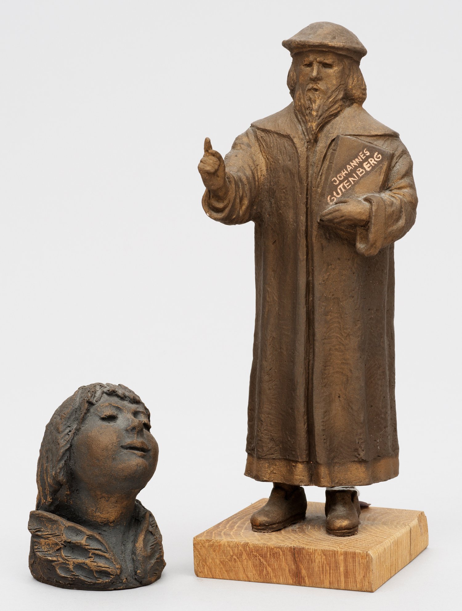 A collection of three slipped and painted earthenware and plaster figures depicting Johannes Gutenberg, a fashionable lady and an angel's head. Two of them monogrammed, one figure mounted on an oakwood base. Major flaws to the figure of the lady.