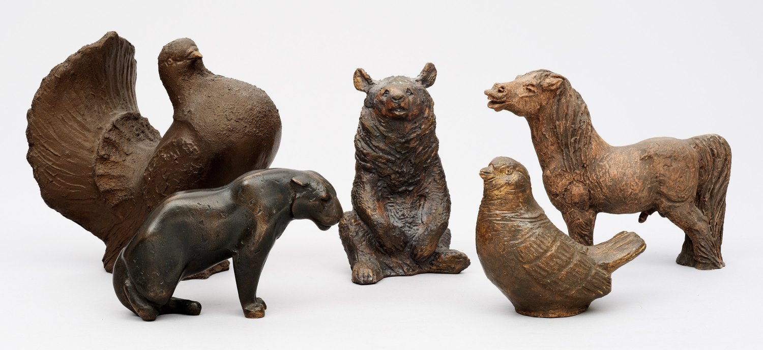 Vier Figuren (Shetland-Pony, Sperling, Bär und Taube) aus dunkelbraun engobierter, teilw. goldfarbener Keramik, Pressmarke "GA"; "Kleiner Panther" (Originaltitel) aus dunkelbraun patinierter Bronze, Guss Lothar Rieke, Worpswede, 1992. H. 10,2 cm-18,5 cm.