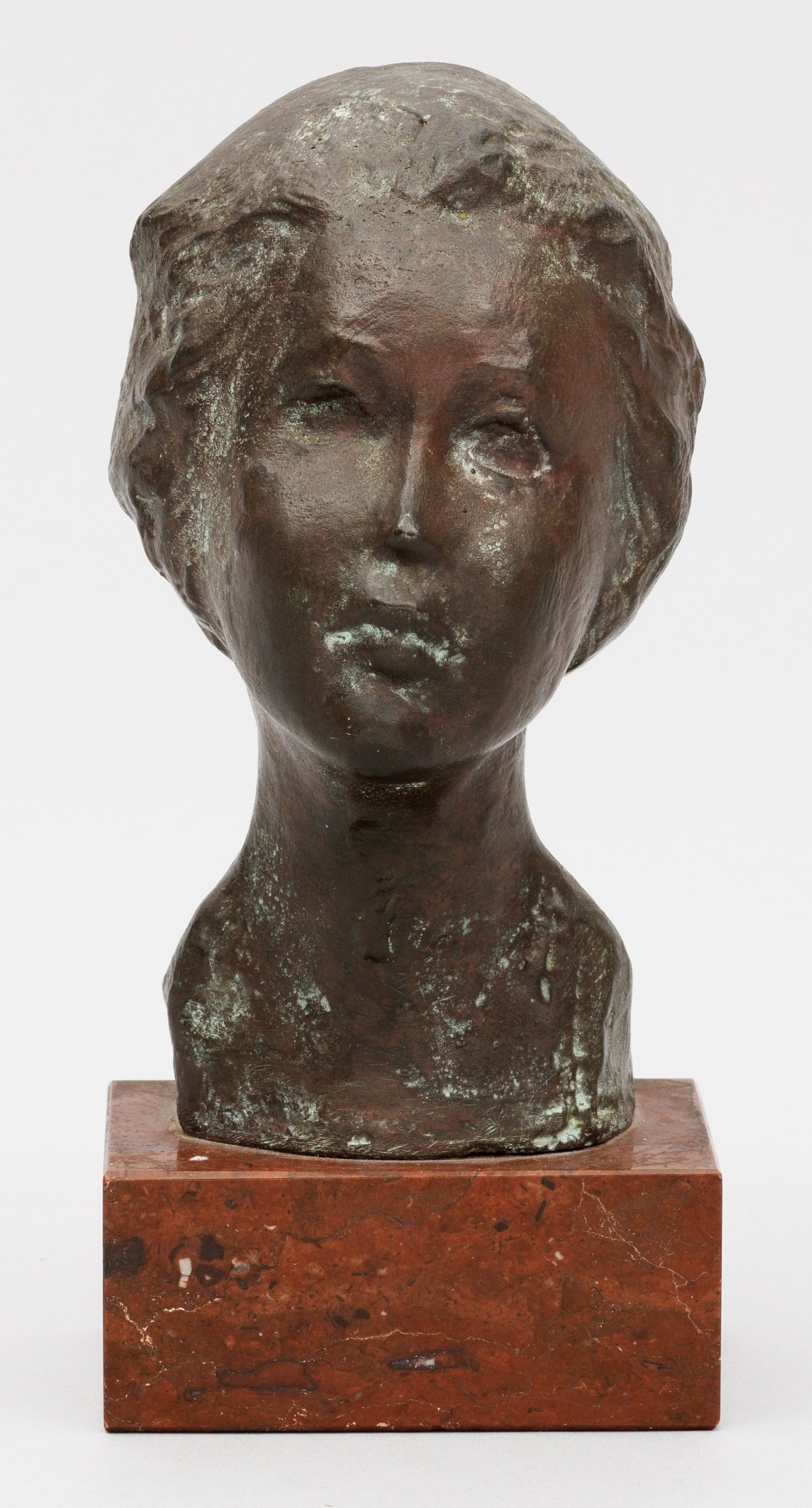 Bronze, dunkel patininiert. Sign. Dunkelrote Marmorplinthe. Die tschechische Bildhauerin studierte an der Akademie in Prag bei L. Pícha und J. Kavan und schuf insebesondere weibliche Aktfiguren. Ges.-H. 18 cm.