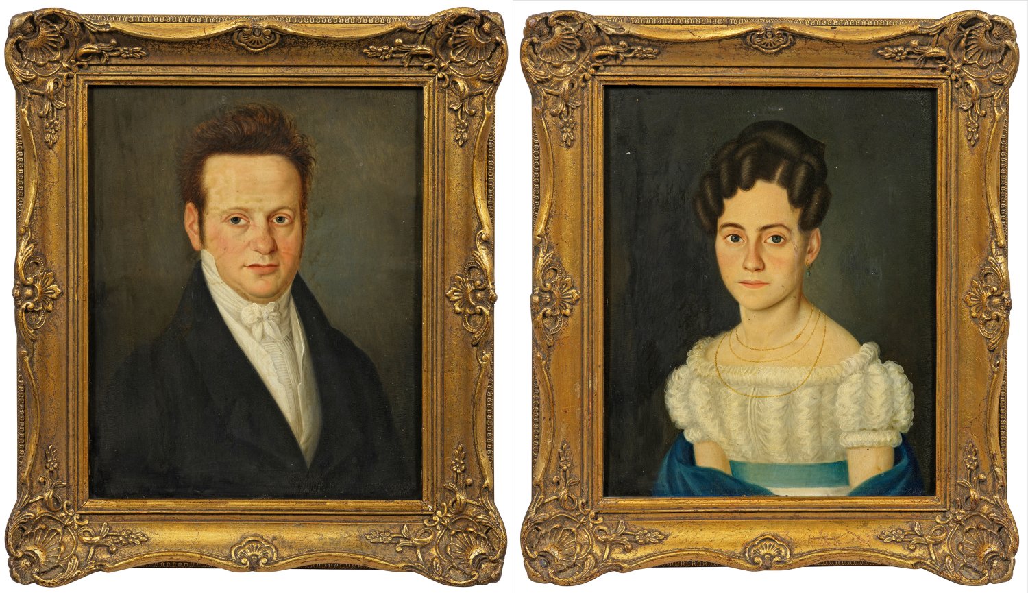 Gegenstücke. Fein gemalte, subtil charakterisierende Bildnisse des jungen, wohlhabenden Paares, laut eines rücks. Klebezettels aus der Familie Unnewehr, Gaste bei Osnabrück. Öl/Metalltafel. Ca. 32 cm x 26 cm. Rahmen.