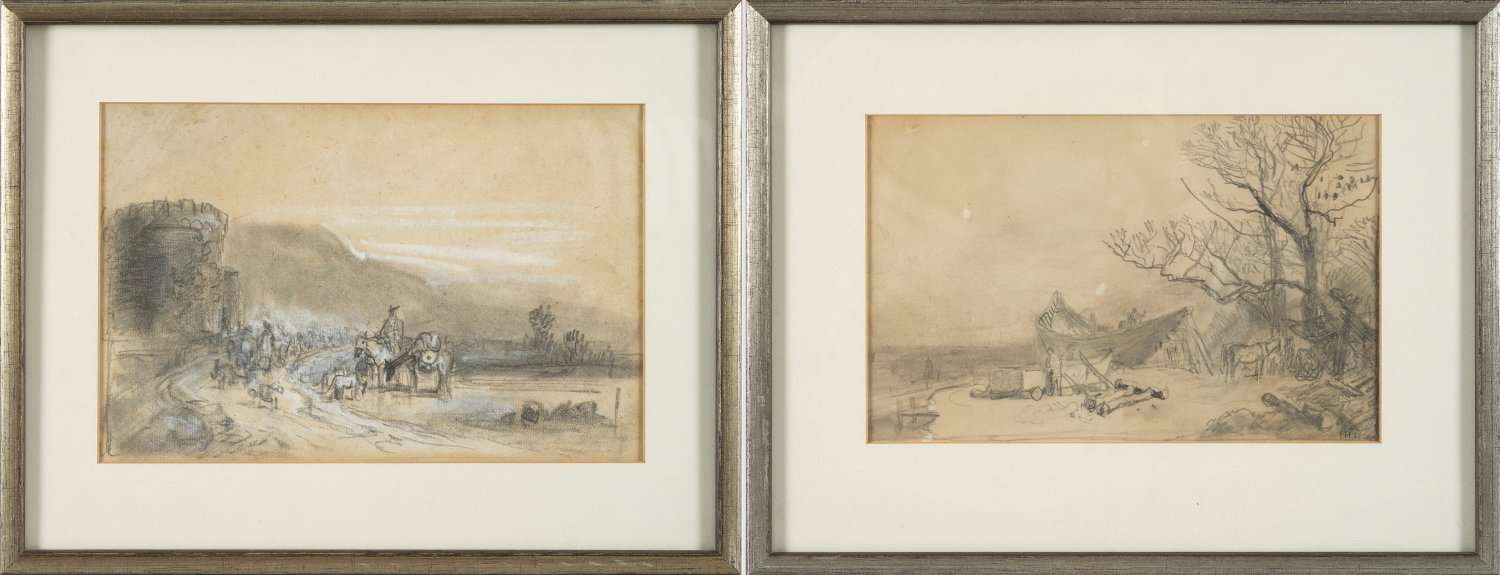Südliche (italienische) Landschaft mit ziehendem Bauer und einem Hirten an einem alten Turm; Landschaft mit Bootsbauer. Bleistift u. Kohle mit Weißhöhungen/Papier. Eine Landschaft (Bootsbauer) mit Monogramm-Stempel "HB" (in Ligatur). 16,5 cm-18 cm x 25,5 cm-28 cm (Passepartoutausschnitt). Rahmen.