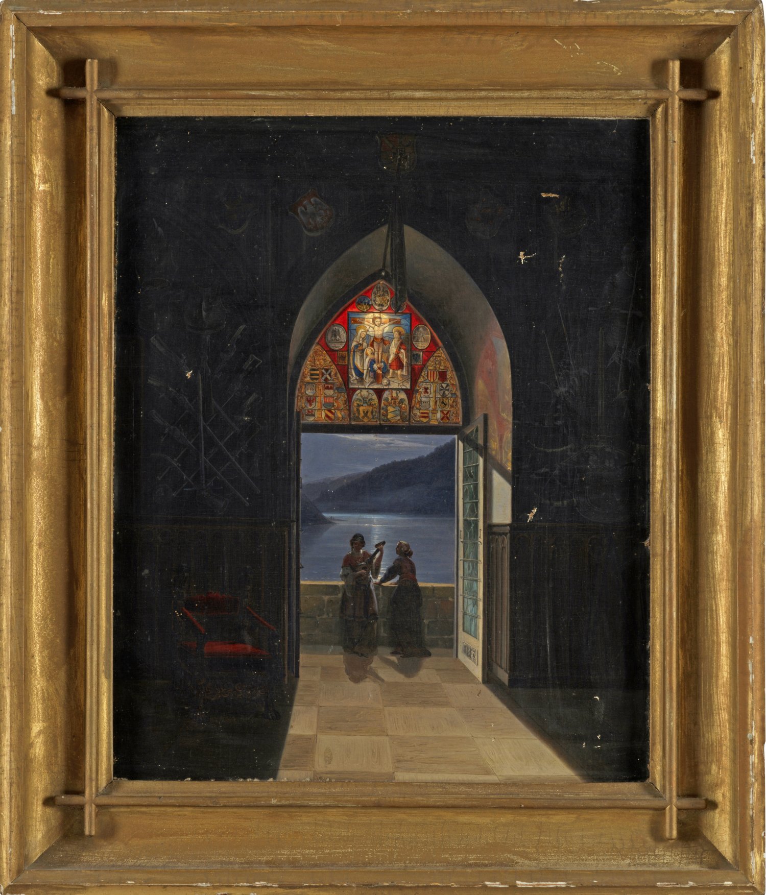 Stimmungsvoller Blick aus dem dunklen Rittersaal der Burg Rheinstein auf zwei junge Frauen auf dem Balkon, mit ihrer Laute, im auf dem Wasser reflektierenden Schein des hellen Mondes, ein Lied anstimmend. Öl/Lwd.; Verso zweifach bez. "Aussicht vom Rittersaal der Burg Rheinstein gemalt von A. Becker (?) 1836". 50 cm x 40,5 cm. Rahmen.