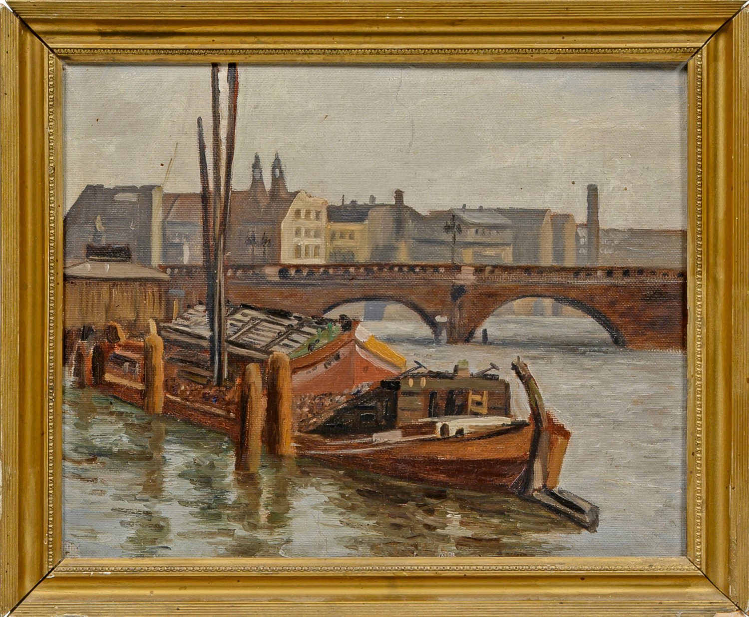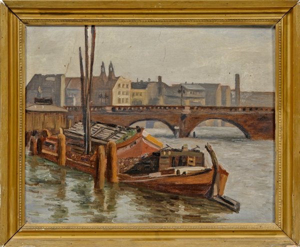 Dynamisch pastos gemalte Ansicht Alt-Berlins aus der Zeit der Jahrhundertwende. Öl/Malpappe. Verso auf Papieretikett bez. sowie mit Ausstellungsetikett. 33 cm x 41,5 cm. Rahmen.