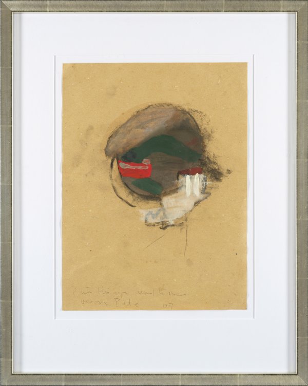 Mischtechnik/bräunliches Papier. Sign. und dat. (20)07 mit persönlicher Widmung. 39,9 cm x 29,9 cm. Rahmen.