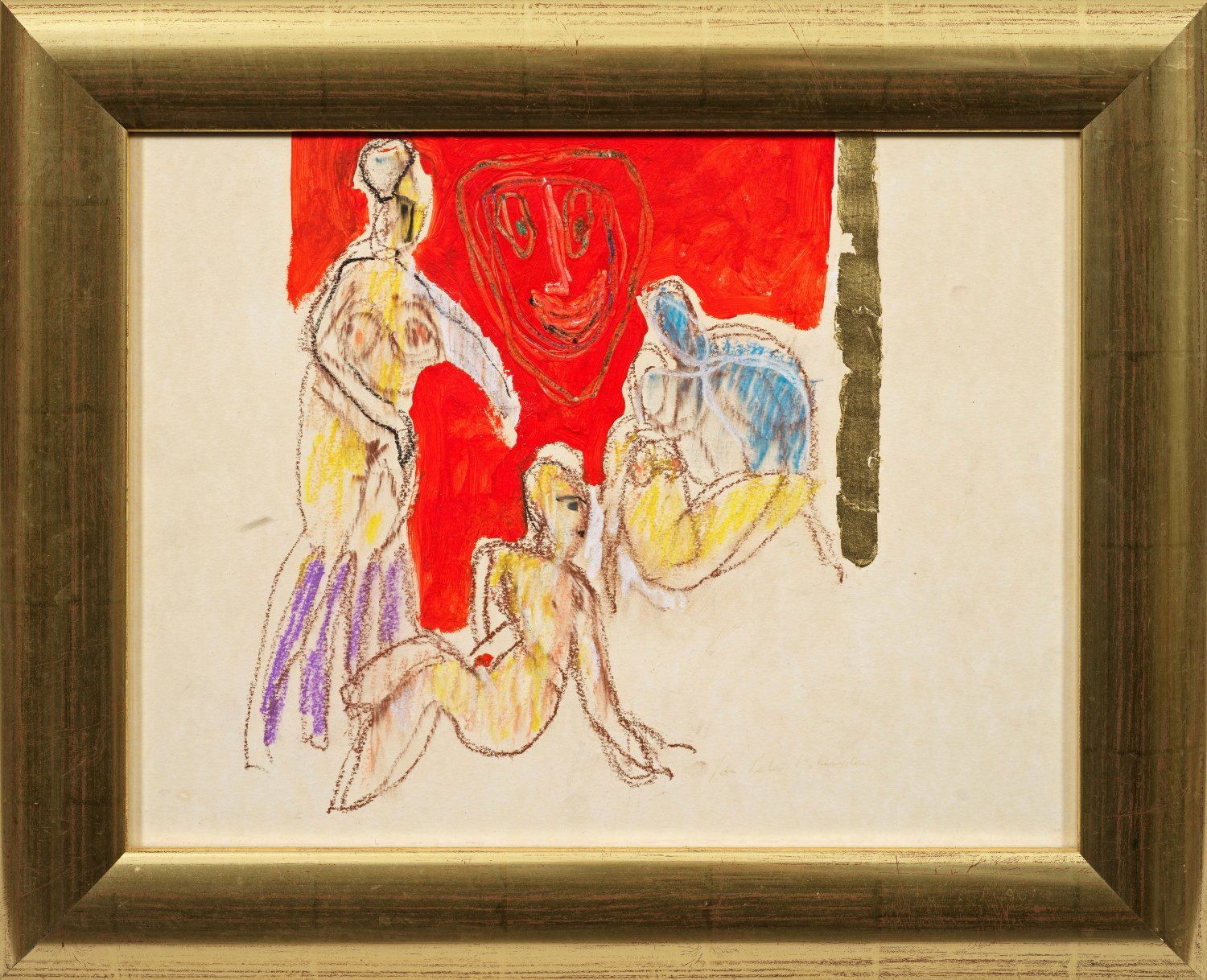 Dynamisch komponierte, charakteristische Arbeit van Opheusdens, dessen Grundthema die Lebensfreude darstellt. Mischtechnik (Öl, Ölkreide, Blattgold)/Papier. R. u. sign.; Blatt ca. 30 cm x 40 cm. Rahmen.