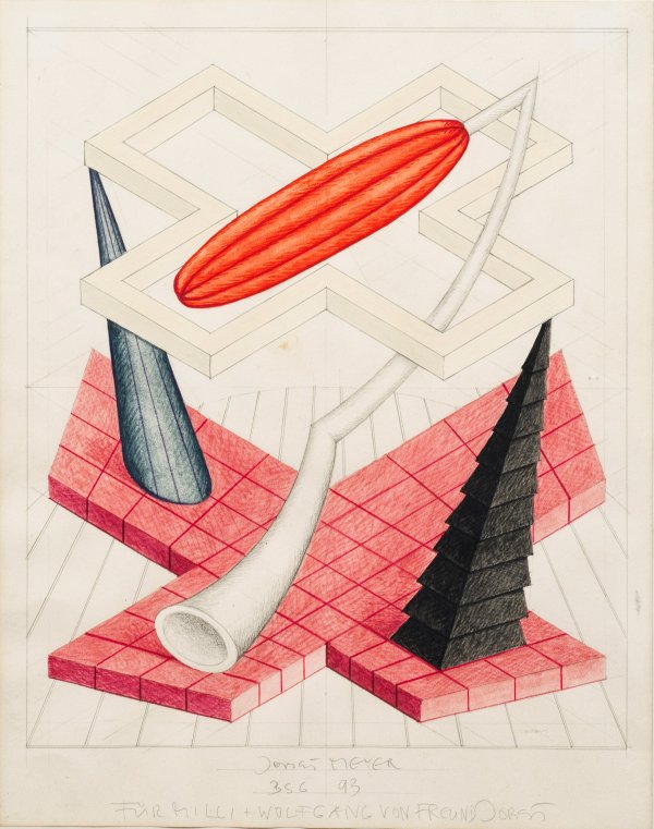 Meyer studierte 1960-1968 in Karlsruhe u. Berlin; 1973 erhielt er den Villa Romana-Preis mit einem Florenz-Aufenthalt. Mischtechnik (Blei-/Buntstift, Aquarell)/Papier. Sign., bez. "BS6"(?), dat. (19)93 sowie mit Widmung. 30,2 cm x 24 cm. Rahmen.