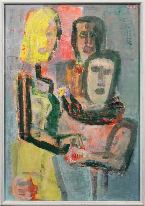 Figurative Komposition Sevcíks, der seit den 1960er Jahren als Kunsthistoriker, Kurator und aktiver Protagonist der tschechisch-slowakischen Kunstszene tätig war. Mischtechnik (Öl, Tempera)/Lwd.; R. oben sign. und vermutlich dat.; Verso sign. u. mit Nr. 162. Galerie-/Ausstellungsetikett. 97 cm x 69 cm. Rahmen.