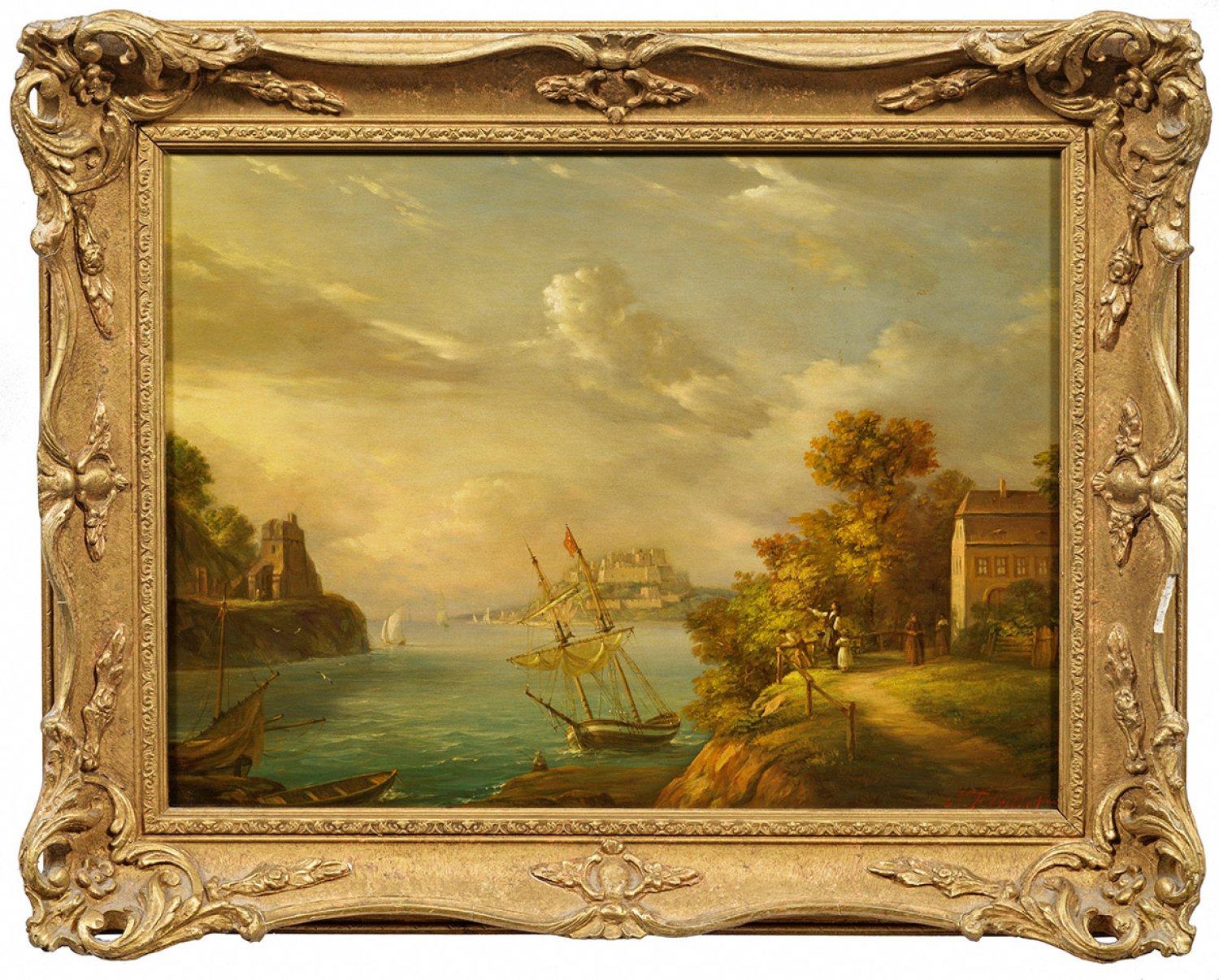 Blick auf eine Bucht, im Hintergrund eine große Festung. Feinflüssig gemalte Stimmungslandschaft in der Tradition von Claude Joseph Vernet. Öl/Platte. R. u. sign.; 31 cm x 41 cm. Rahmen.