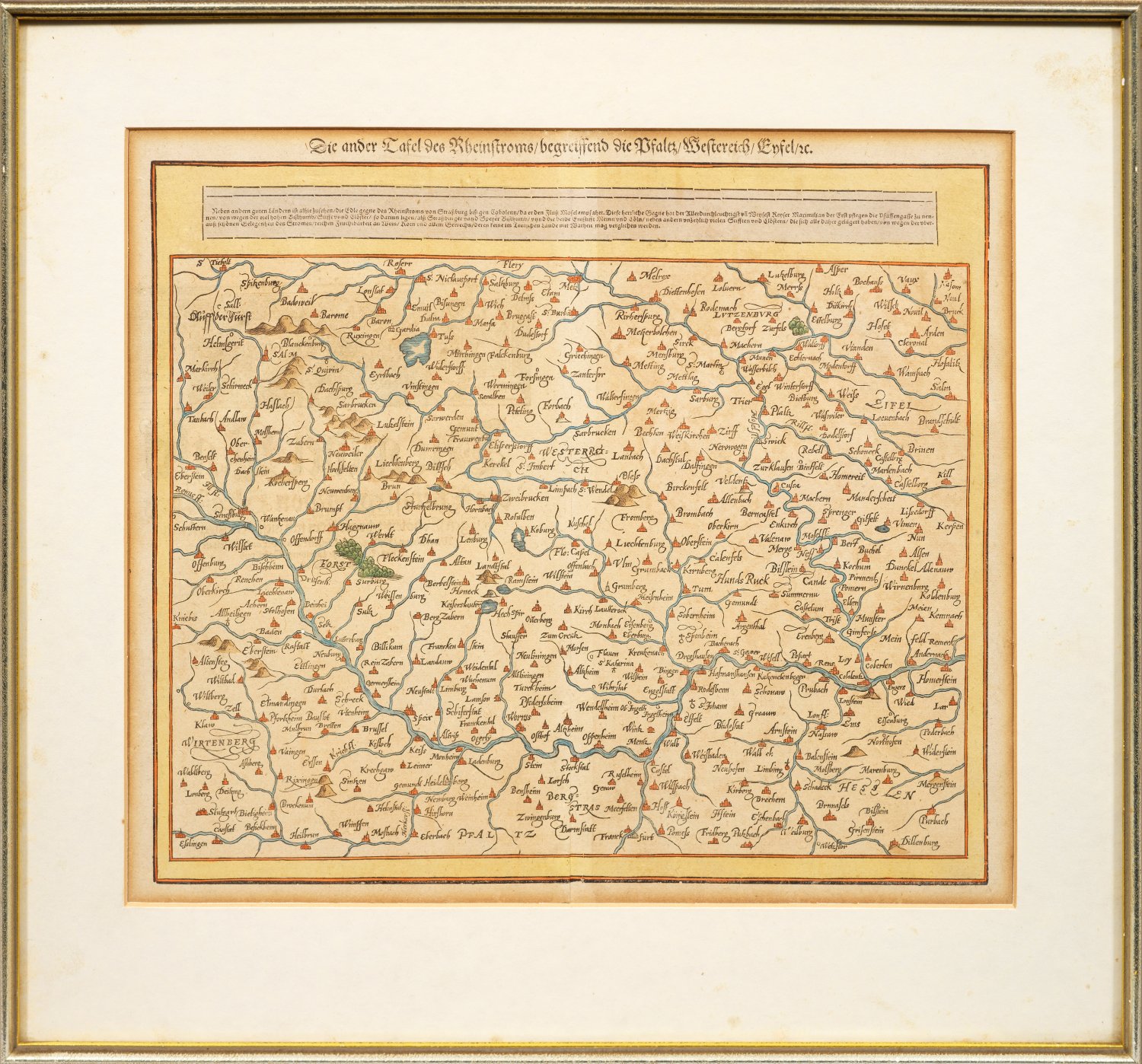 Kolorierter Holzschnitt aus Sebastian Münsters Cosmographia, erschienen bei Sebastian Henricpetri, Basel, wohl 1628. Die Karte zeigt den Rheinlauf zwischen Straßburg und Bonn, mit Teilen der Vogesen, des Schwarzwaldes, der Rheinpfalz, des Odenwaldes, des Hunsrücks, des Taunus und der Eifel. Darstellung ca. 30,5 cm x 35,5 cm. Rahmen.