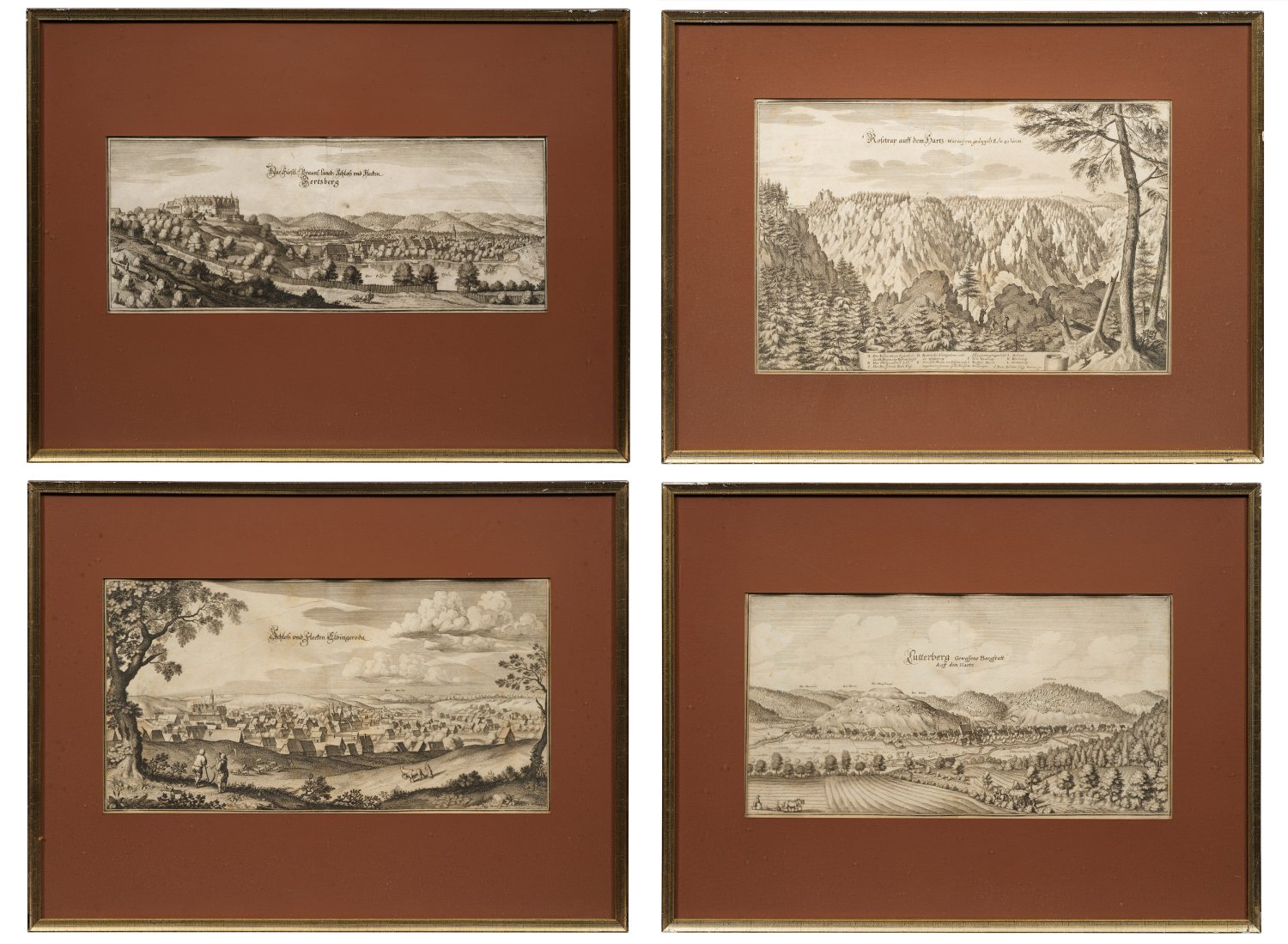 Vier Kupferstiche aus Merians "Topographia", 2. Hälfte 17. Jh.; "Das Fürstl: Brauns: Lüneb: Schloss und Flecken (/) Hertzberg", "Lutterberg Gewessene Bergstatt (/) Auff dem Hartz", "Rosstrap auff dem Hartz, war auf ein gedoppelt Echo zu hören" sowie "Schloss und Flecken Elbingeroda". Darstellung 14,8 - 23 cm x 35,6 - 38,5 cm. Rahmen.