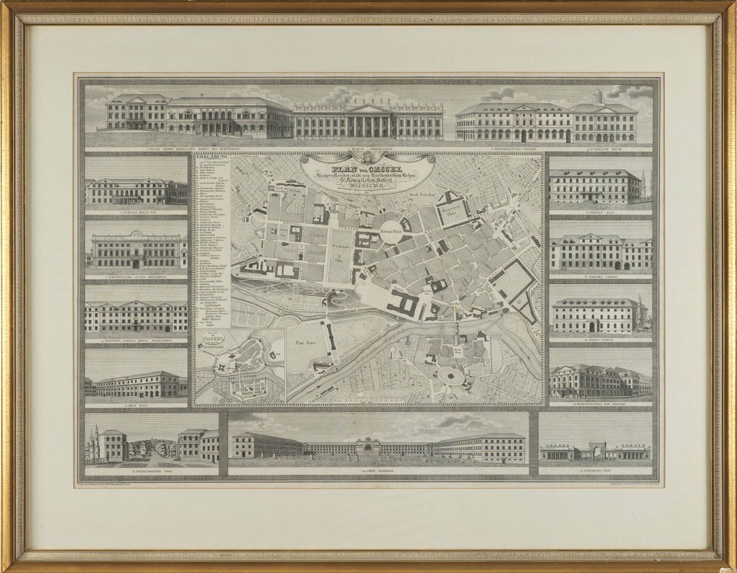 Kupferstiche bzw. Lithographie, teilw. koloriert/Papier. Dabei: "A plan of the City Babylon according to Herodotus and F. Kircher" (1732); "Plan der Hochfürstl. Residenz- und Haubt-Stadt Cassel in Nieder-Hessen", Homann Erben (1742); "Plan von Cassel - Haupt- und Residenzstadt vom Kurfürstenthum Hessen", B. Herder im Verlag der Luckhardtschen Hofbuchhandlung (1830); "Mappa Geographica exhibens Postas omnes tam vehiculares quam veredarias totius Germaniae", T. C. Lotter bei Aug. Vind (1769). 33-52 cm x 44,4-64 cm (Passepartoutausschnitte). Rahmen.