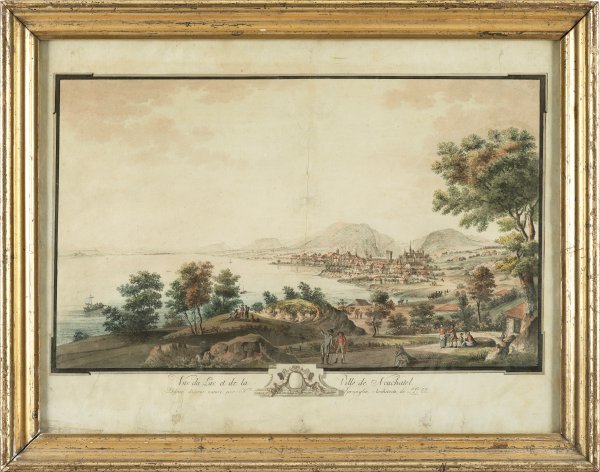 Kolorierter Kupferstich/Papier. Malerischer Blick auf Neuchâtel von Nordosten, belebt durch Personenstaffage. Darstellung 29,2 cm x 48,1 cm. Rahmen.