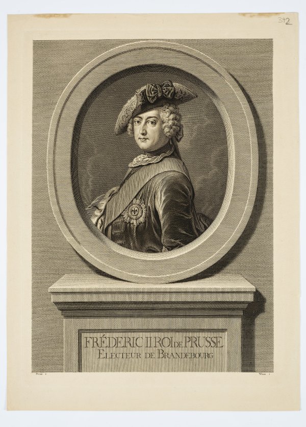 Teilw. seltene Blätter in verschiedene Techniken. Enthalten sind: allegorisch Porträt "Friederich der Grosse König von Preussen" als Ritter, Radierung von J. H. Rode (1727 - 1759) nach C. B. Rode (1725 - 1797), um 1749-1759; allegorisches Porträt mit Szenen des 7-jährigen Krieges 1756/57 und Lobgedicht, Kupferstich von B. Hübner (1727/37 - nach 1795) nach A. Scheller (1719 - 1790), um 1759; allegorisches Porträt, Kupferstich von H. Cöntgen (1727 - 1792); allegorische Szene "Balance de Fréderic", Kupferstich von V. Vangelisti (1728 - 1798), 1780; Porträt "Frederic II. Roi de Prusse", Punktierstich bzw. Schabkunstblatt (Mezzotinto) von Charles Townley (1737 - 1805) nach F. W. Bock (1759- 1829), erschienen bei Gaspare Weiß, Berlin, um 1800; Porträt "Friederich II. in seinen letzten Tagen". Punktierstich bzw. Schabkunstblatt (Mezzotinto) von J. G. Scheffner (1765 - 1825) nach J. Graetsch, 1795; Bildnis "Fréderic II Roi de Prusse (/) Electeur du Brandenbourg" von J. G. Wille (1715 - 1808) nach A. Pesne (1683 - 1757), Fasksimile Reichsdruckerei, Berlin, um 1900. Blatt ca. 17,6 cm- 61 cm x 12,5 cm-46 cm.