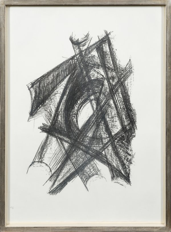 Lithographie/BFK Rives Velin, 1971/1972. Nummeriert 100/6. Erschienen anlässlich der Ausstellung vom 27. Nov. 1971 - 25. Jan. 1972 in der Galerie im Erker St. Gallen. Blindstempel der Erker Presse, St. Gallen. Blatt ca. 76,5 cm x 56 cm. Rahmen.