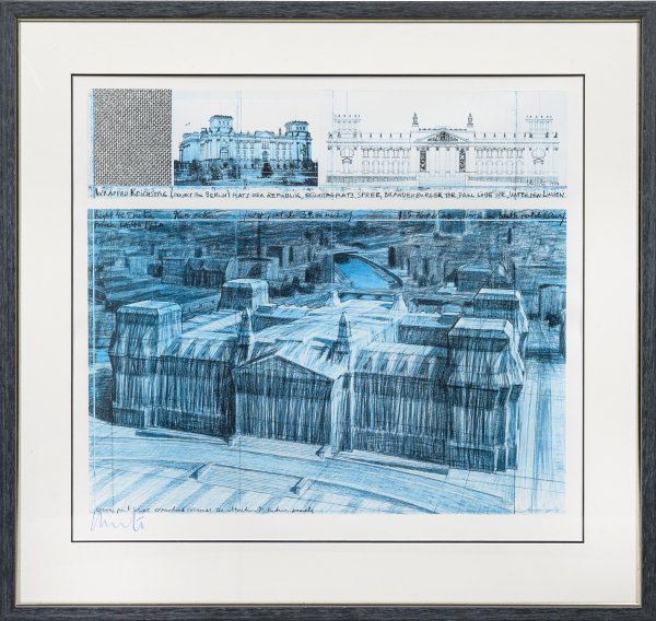 Farboffsetdruck/Papier. L. u. von Christo in Blau sign.; Grafische Wiedergabe einer Collage mit Entwurfsskizzen zum 1995 realisierten Reichstagsrojekt des Künstlerpaares.Darstellung 62 cm x 69,5 cm. 67,5 cm x 73,8 cm (Passepartoutausschnitt). Rahmen.