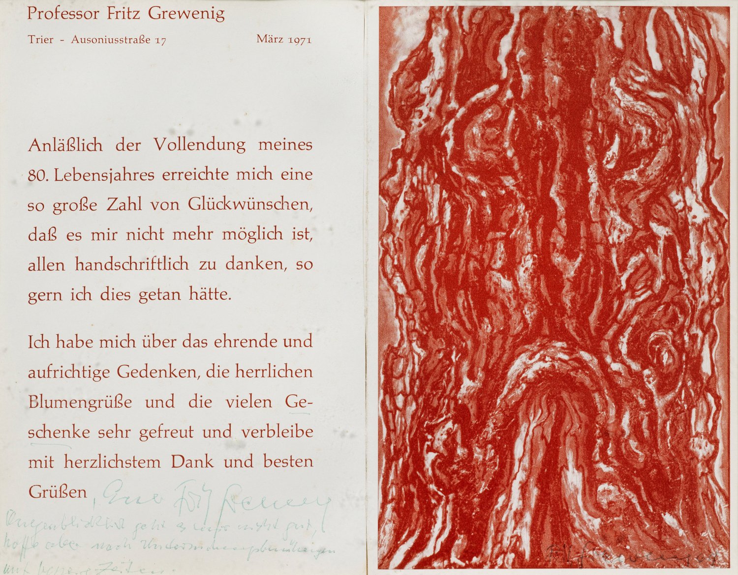 Acknowledgement card on the occasion of the artist's 80th birthday. Offsetprint in colours on light cardboard, 1969/1971. Hand-signed, dated and with handwritten inscription.