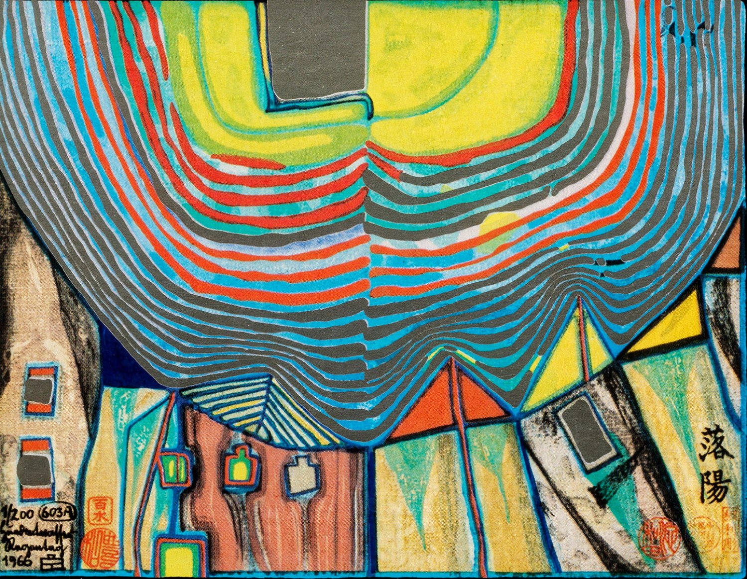 Offsetprint in colours after a woodcut by Friedensreich Hundertwasser from the portfolio "Nana Hyaku Mizu". Signed and inscribed in the print.