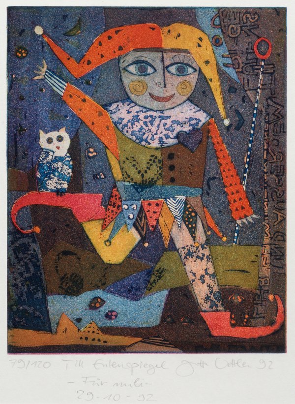 Farbaquatintaradierung/Velin, 1992. Sign., dat. (19)92, betitelt, mit Widmung sowie nummeriert 79/120. Plattenmaß ca. 25 cm x 20 cm. Ca. 31,5 cm x 25,7 cm (Passepartoutausschnitt). Rahmen.