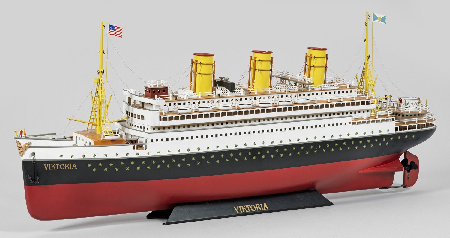 Lackiertes Metall bzw. Kunststoff. Detailreiche Darstellung des 1889 vom Stapel gelaufenen Passagierdampfers "Augusta Victoria", einst Flaggschiff der ehemals größten Reederei der Welt, der „Hamburg-Amerikanischen Packetfahrt-Actien-Gesellschaft“, gen. Hapag. Schwimmfähig. Mit Uhrwerkantrieb. Art.-Nr. 16150. Ein Rettungsboot und Fahnenmast besch.; L. 98 cm.