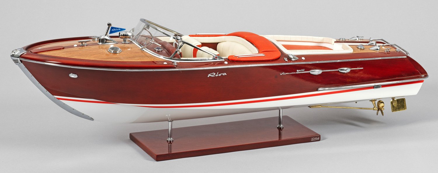 Unterschiedliche Edelhölzer, furniert. Metall und Leder. Detailgetreue Darstellung eines Speedbootes "Aquarama- special" in der Art der legendären Yachten von Riva. Auf Sockelplatte. Mit Zertifikat. H. 25 cm. 87 cm x 27 cm.