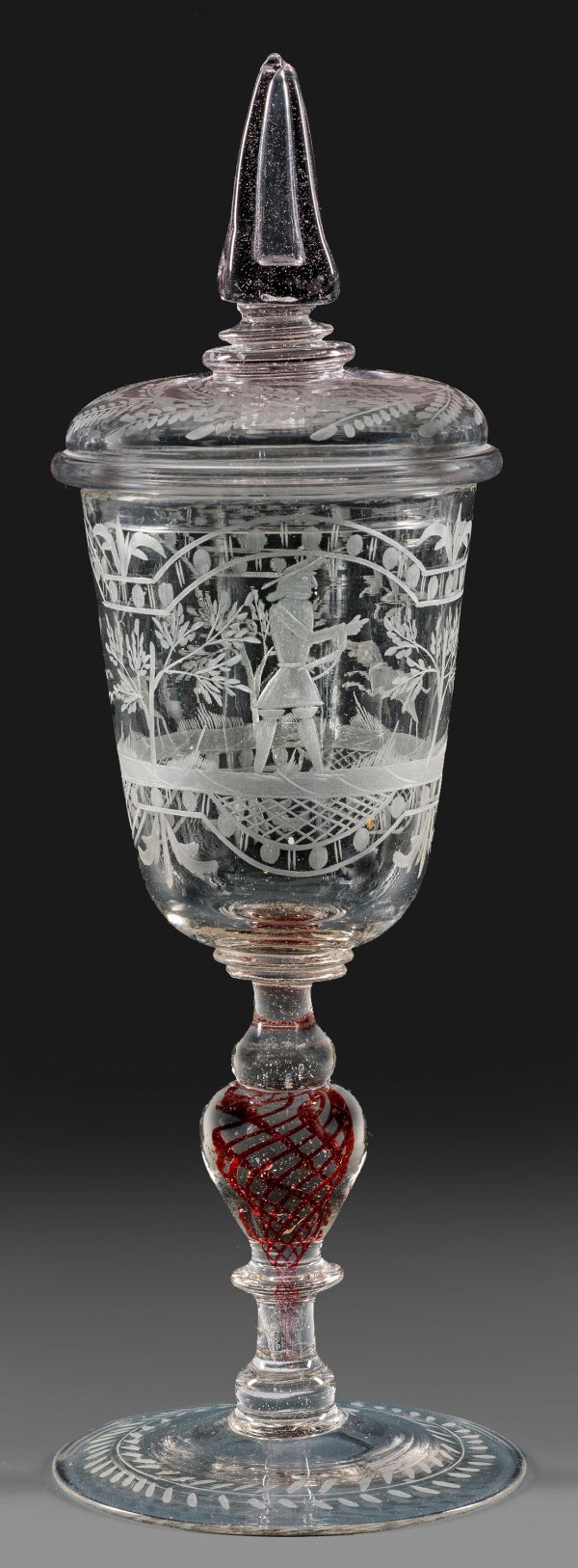 Farbloses Glas, im Schaft eingeschmolzene Rubinglas-Spiralfäden. Leicht ansteigender Scheibenfuß mit Abriss, Balusterschaft mit Scheibennodi, auf der konischen, unterhalb gerundeten Kuppa geschnittener, umlaufender, dreifach gegliederter, durch stilisierte Bäume flankierter Dekor aus einem schreitenden Jäger, springenden Hund und fliehenden Rothirsch. Leicht gewölbter Haubendeckel mit Blattrankenbordüre, der obeliskförmige Knauf mit eingestochener Luftblase. H. 30,7 cm.