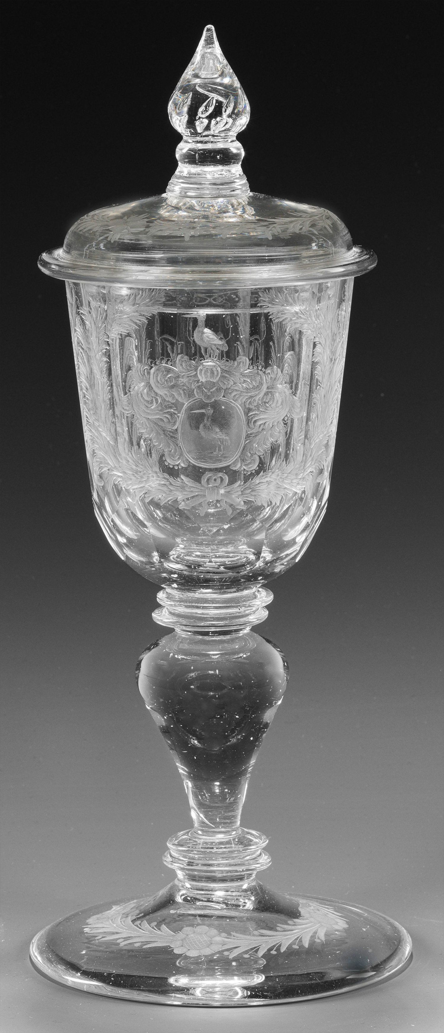 Farbloses Glas. Ansteigender Scheibenfuß, der Balusterschaft mit jeweils zwei Scheibennodi zum Fuß und zur Kuppa, leicht gewölbter Deckel, im tropfenförmigen Knauf kleine eingestochene Luftblasen. Die Kuppa facettiert bzw. wabenfacettiert, feiner, tief geschnittener Dekor aus einem Wappen mit Storch bzw. bekröntem Monogramm, umrahmt von Blattzweigen bzw. Palmwedeln, seitlich jeweils eine Blumenvase. Der Fuß und Deckel umzogen von geschnittenen Blatt- und Blütenranken. H. 23,5 cm.